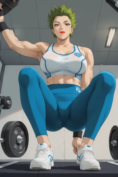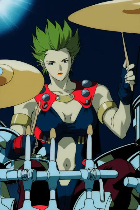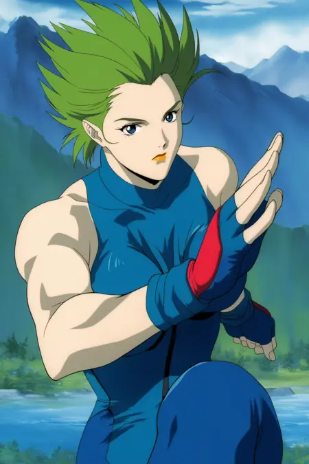주 프롬프트: Veffidas_Feaze, 큰 가슴, 짧은 녹색 머리, 송곳니 같은 머리, 립스틱, 메이크업, 파란 눈, 근육질 여성, 레트로 아트 스타일, 1990년대 (스타일)