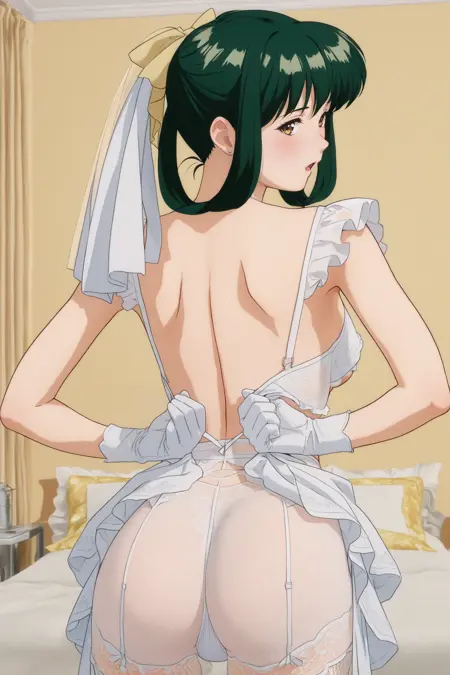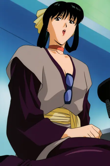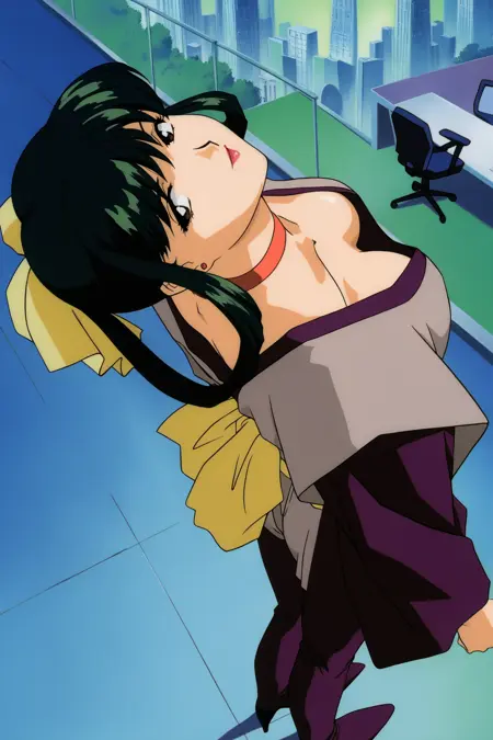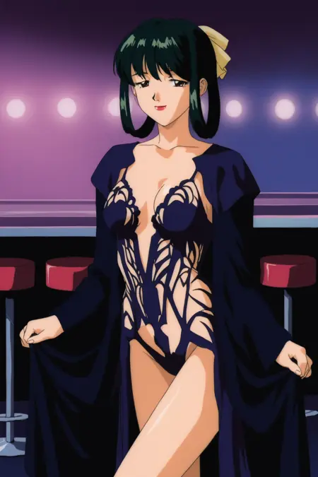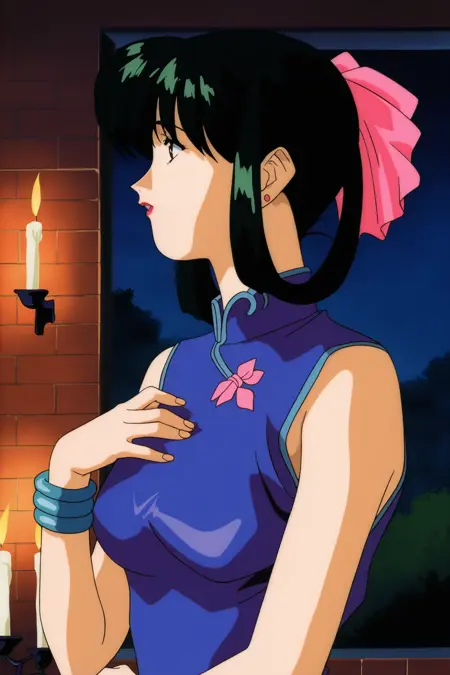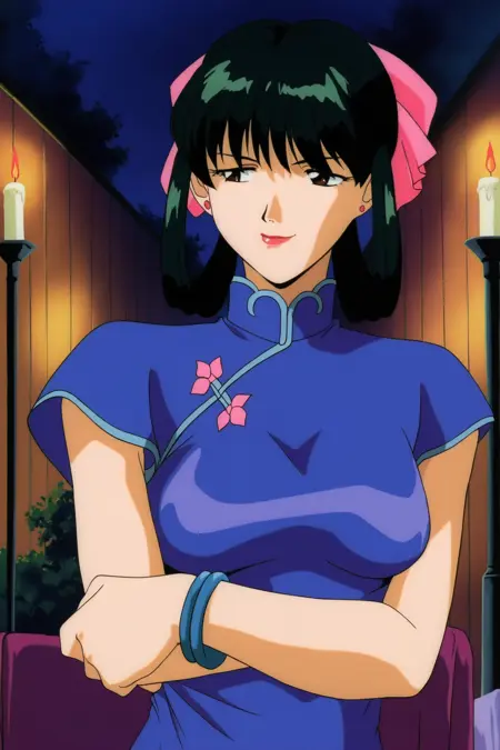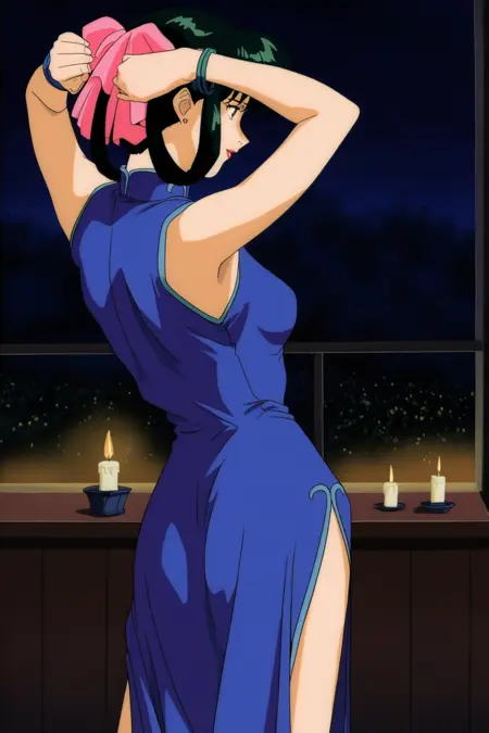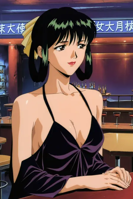 メインプロンプト: Akiko_Houjoh、髪の輪、濃い緑色の髪、アップドゥ、髪リボン、茶色の目、赤い唇、化粧、スタッドイヤリング、1990年代(スタイル)、レトロアートスタイル