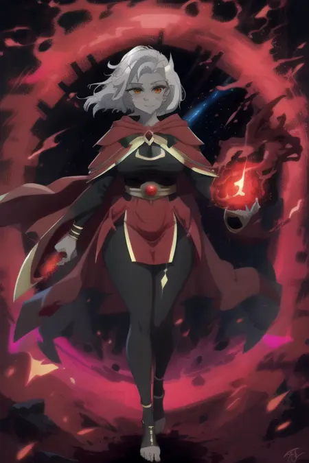 - supreme-calamitas,严肃表情,紧闭双唇,发光琥珀色眼睛,锐利发光琥珀色眼睛,动漫眼线,动漫角色睫毛,红金斗篷,红金长袍,鼻子上有疤痕,灰色皮肤,灰皮肤,面部皮肤开裂,黑色瞳孔,手持火球,手持红色火球,位于红色火球内部,红色火流星,火山背景,红色火焰背景,红色岩浆地面,正在充能强力红色攻击,被红色激光包围,显著的角,全身,远景,明亮的红色太阳,红色火球,红色火球内部,旋转的红色激光,灾厄硫磺之火,红色火焰,丰满,黑色紧身裤,粗大腿,宽臀部,黑色紧身裤,赤脚