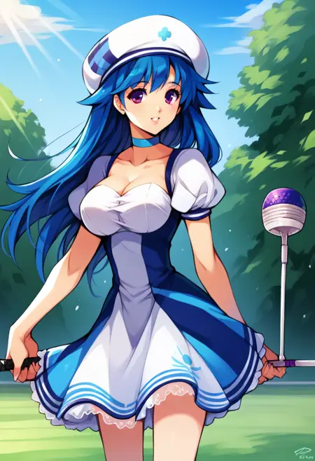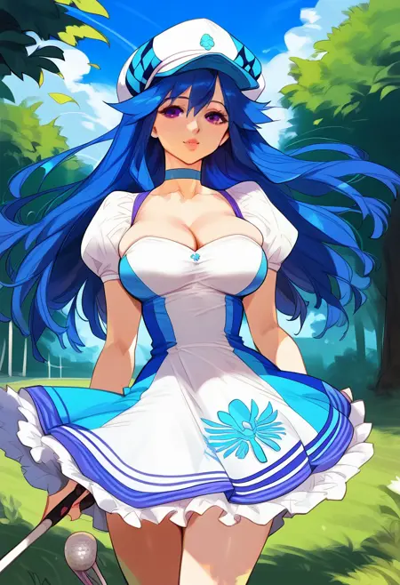 트리거: arinp, 긴 머리, 파란 머리 여자, 보라색 눈, 모자, 큰 가슴, 드레스, 치커, 골프 클럽
