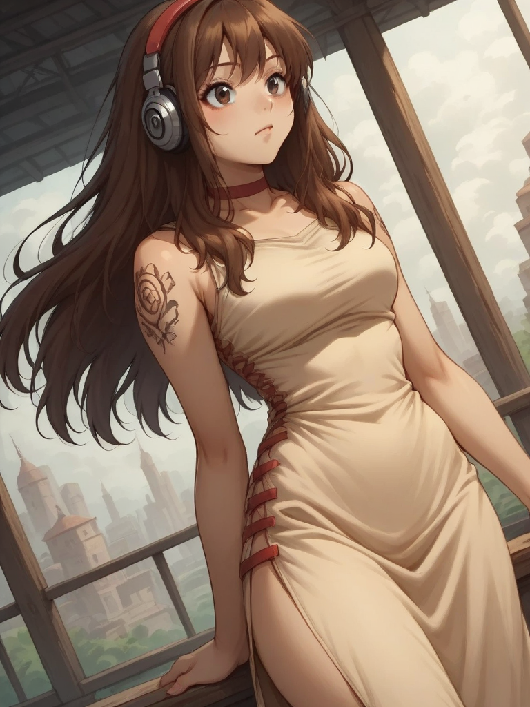茶色の髪、茶色の目、ヘッドホン、長い髪、赤いチョーカー、