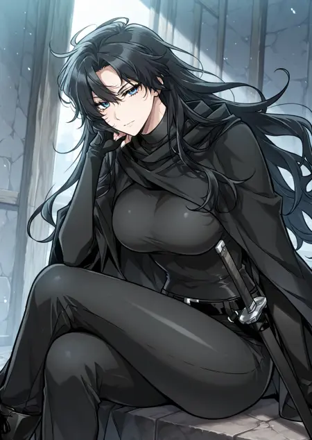 black outfit, black cloak, black long coat, cape, tight suit, black belt, black gloves, black pants, black boots, tactical outfit, katana, sword, sword sheath,