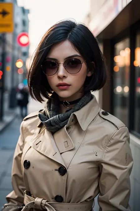 一幅超高清、色彩丰富、细节精致的肖像,24岁女孩,面部细节丰富,黑色短发,黑色眼睛,妆容,穿着高领外套,黑色墨镜,脖子上围着灰色围巾,手表手链,表壳,领口,项圈,史诗级角色构图,alessio albi, nina masic,锐利对焦,自然光线,次表面散射,f2,35mm