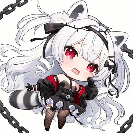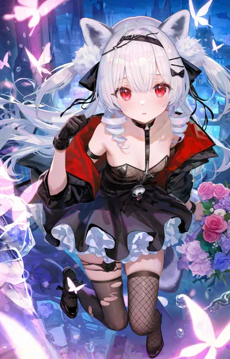GSLirohela, 1girl, thighhighs, solo, animal ears, fishnets, tail, long hair, red eyes,, white background, black footwear, jacket, dress, gloves, torn thighhighs, simple background, white hair, chain, black gloves, fishnet thighhighs, looking at viewer, hairband, black thighhighs, black dress, two side up, bare shoulders, small breasts, strapless, hair ornament, off shoulder, black jacket, rose, open jacket, breasts, single glove, flower, frills, torn clothes, x hair ornament, animal ear fluff, very long hair, raccoon ears, open clothes,