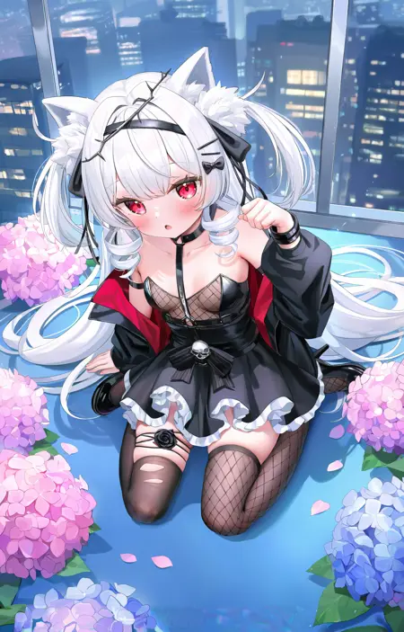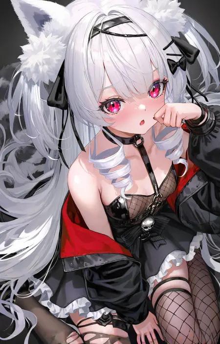 girl,GSLirohela solo, animal ears, tail, long hair, red eyes, frills, two side up, small breasts, white hair, hairband, hair ornament, strapless, ribbon, animal ear fluff,