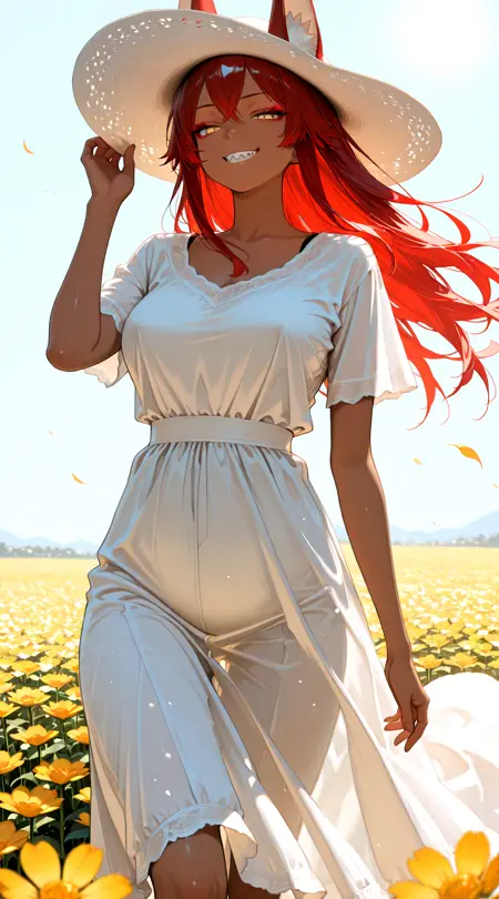 Example Prompt: niploutline, red_hair, gold, yellow_eyes, red_eyeshadow, smug, long_hair, jackal_ears, sharp_teeth, simple white_dress, wind, sun_hat, flower_field, smile,
