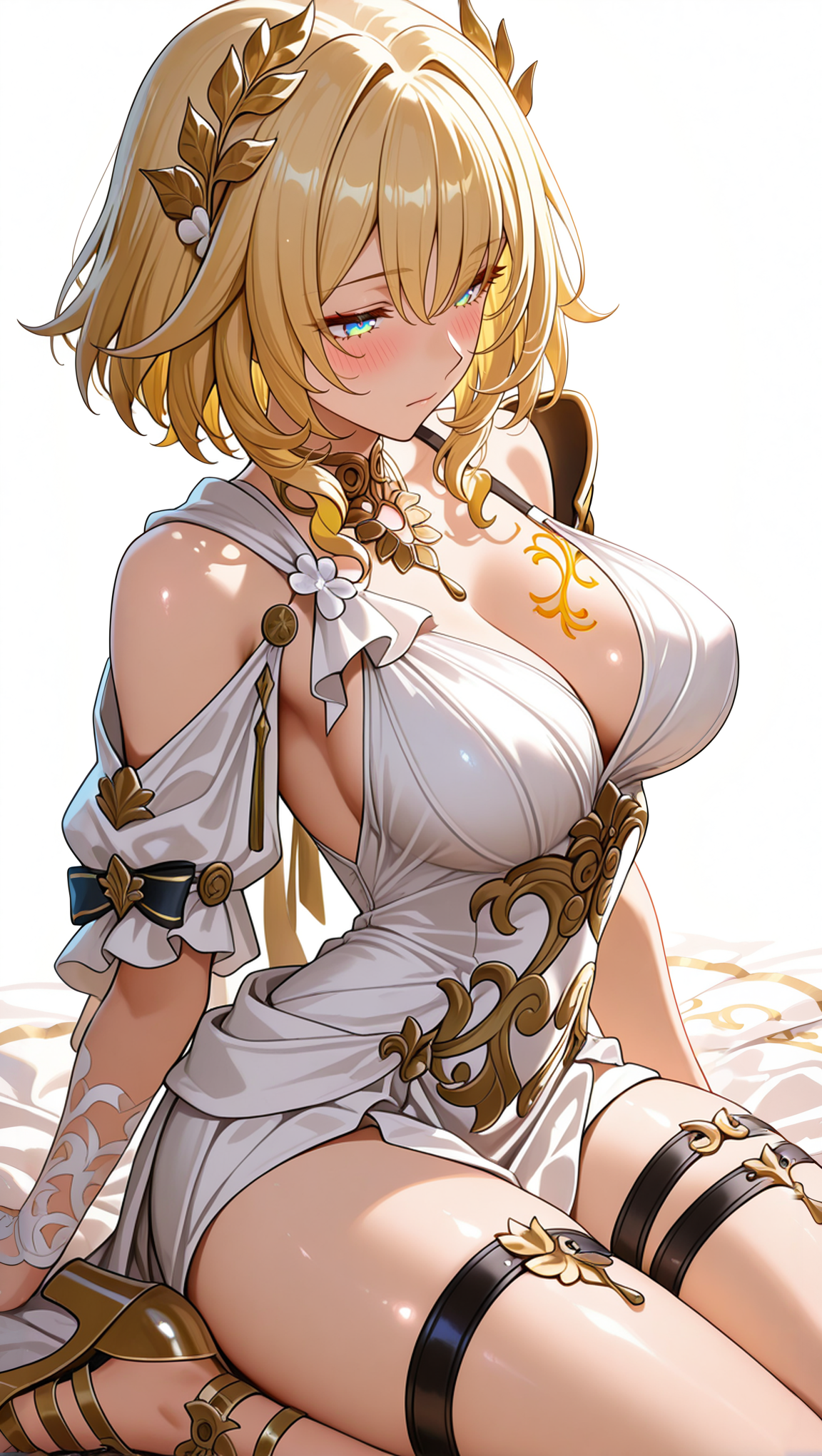 • ローレル冠、冠、ローレル冠、豪華なドレス、白いドレス、袖なしドレス、片肩アーマー、肩アーマー、左肩アーマー、太ももストラップ、黒い太ももストラップ、ローレルテーマ、右太ももストラップ、グラディエーターサンダル、ハイヒールサンダル、ゴールドの靴