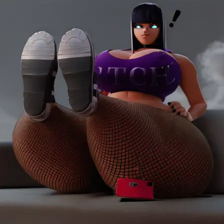 Hallie(Goth), Purple Tank Top, Text on tank top(bitch), midriff, black hair,chain, fish net leggings, big shoes,platform shoes,black shorts, goth, black lipstick,heavy eyelashes,eyeshadow,purple eyes,long hair,3D,3D Render,