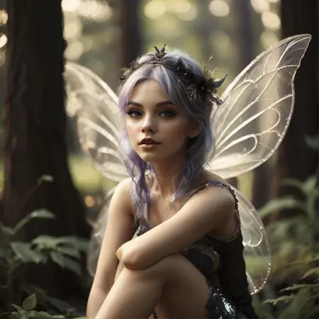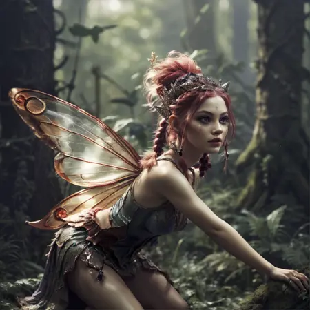 1girl, antennae, armlet, armor, bangs, bare shoulders, barefoot, belt, black hair, blonde hair, blue dress, blue eyes, blue hair, blunt bangs, blurry, blurry background, boots, bracelet, braid, breasts, brown eyes, brown hair, butterfly wings, choker, cleavage, corset, crown, curly hair, dark skin, dark-skinned female, depth of field, double bun, dress, earrings, facepaint, facial mark, fairy wings, flying, garter belt, gloves, green eyes, hair bun, hair ornament, hairband, head wreath, headband, insect wings, jewelry, lingerie, long hair, looking at viewer, looking to the side, makeup, medium breasts, midriff, multicolored hair, nail polish, navel, necklace, parted lips, pink hair, pointy ears, purple hair, realistic, red hair, ring, rpgpixie, short hair, sitting, skirt, sleeveless, small breasts, solo, tattoo, teeth, tiara, twin braids, upper body, wavy hair, white hair, wings, yellow eyes