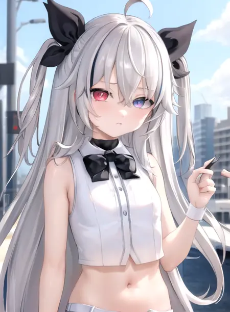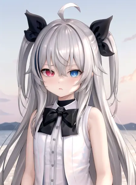 Nisha Nixyeva, 1girl, solo, long hair, oo bangs, blue eyes,red eyes, grey hair, heterochromia, streaked hair, bow, ribbon, hair ribbon,two side up, hair between eyes, very long hair, ahoge,