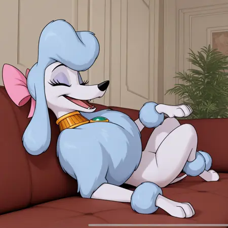 georgette, dog, poodle, black eyes, eyelashes, blue hair, necklace, pink bow, hair bow