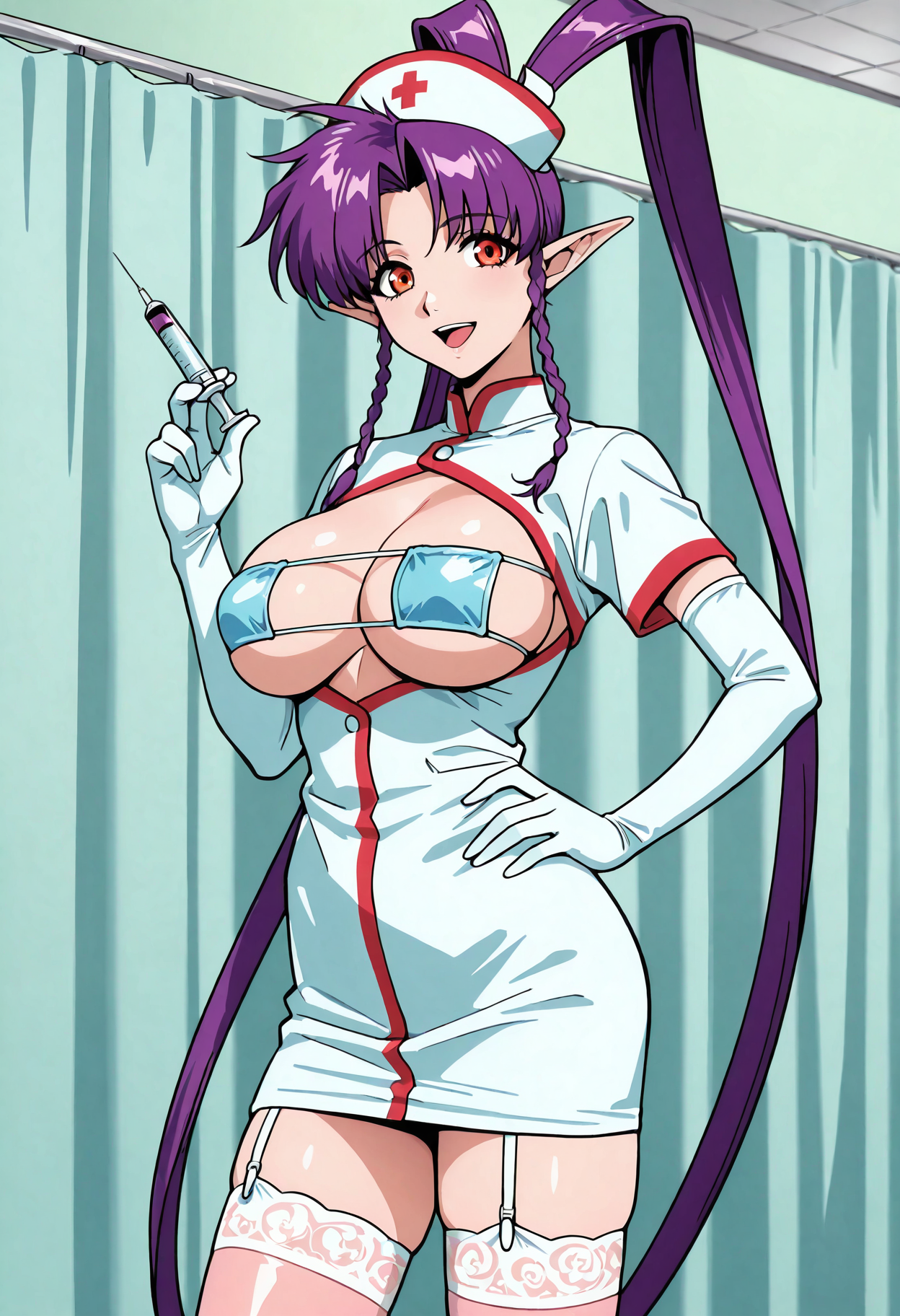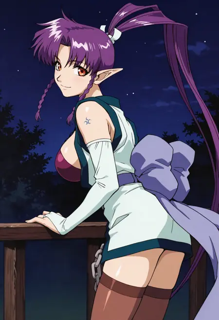 yaone, orange eyes, purple hair, side braids, twintails, high ponytail, very long hair, pointy ears, large breasts