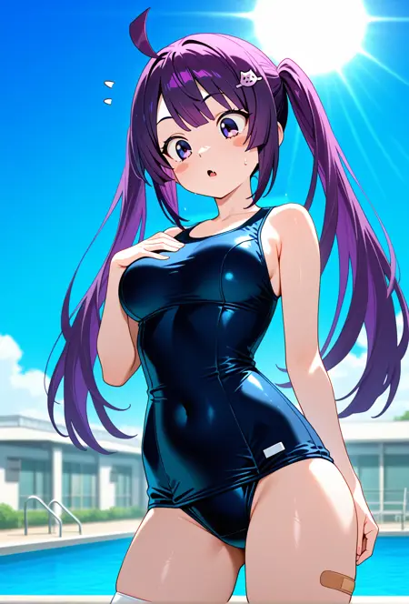 1girl, ToneRion, solo, twintails, thighhighs, long_hair, fingerless_gloves, gloves, pink_hat, fang, purple_hair, bandaid, ahoge, purple_eyes, blush_stickers,double tone dress, boots, looking_at_viewer, thigh_boots, pink_footwear, bandaid_on_leg, green ribbon,cat hair ornament,robot antenna, hands-free microphone,tie,