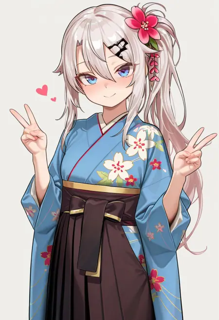 kimono, long hair, side ponytail, hair flower, floral print, print kimono, floral print kimono, blue kimono, hakama, hakama skirt, black hakama, brown footwear, cross-laced footwear,