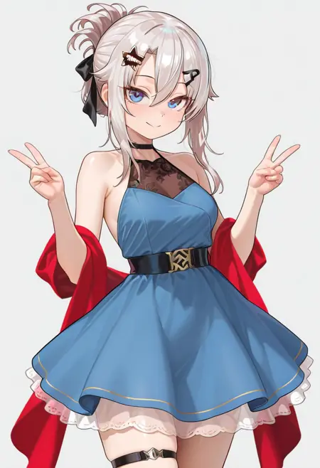 dress, long hair, folded ponytail, hairclip, choker, blue dress, sleeveless dress, halterneck, see-through cleavage, black belt, thigh strap, red shawl, white petticoat, lace petticoat, high heels,