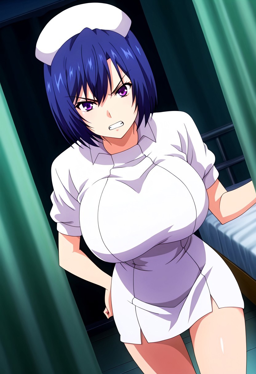Tachibana,purple_eyes, blue hair, short_hair, huge_breasts,