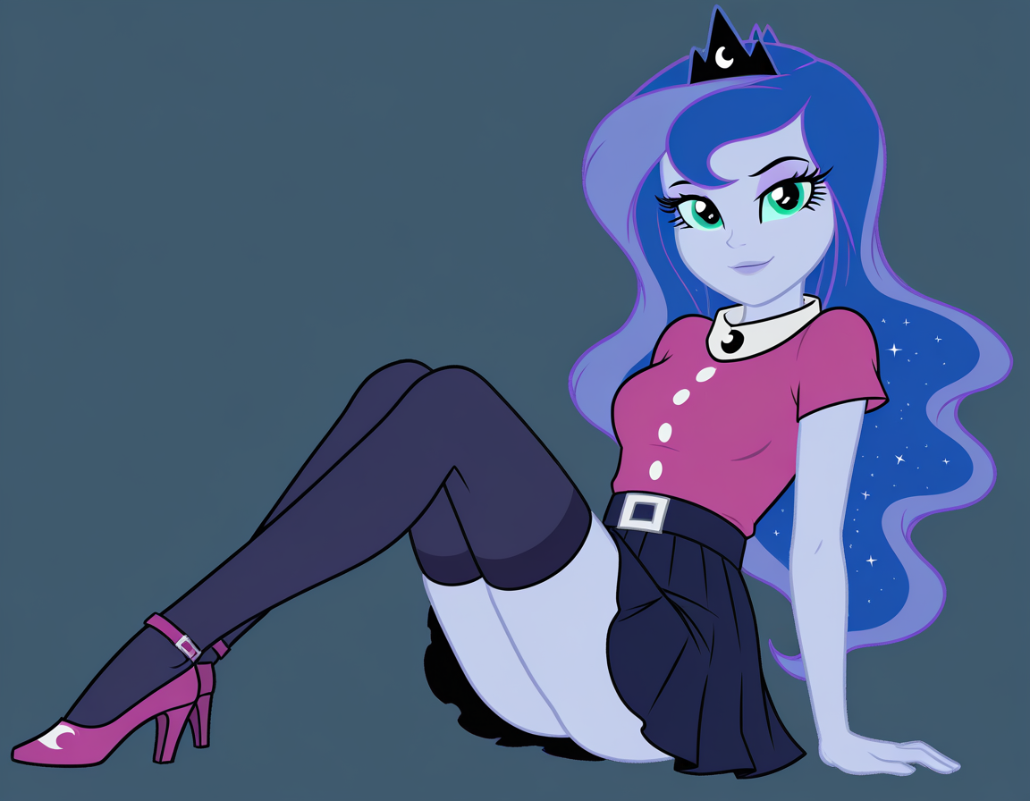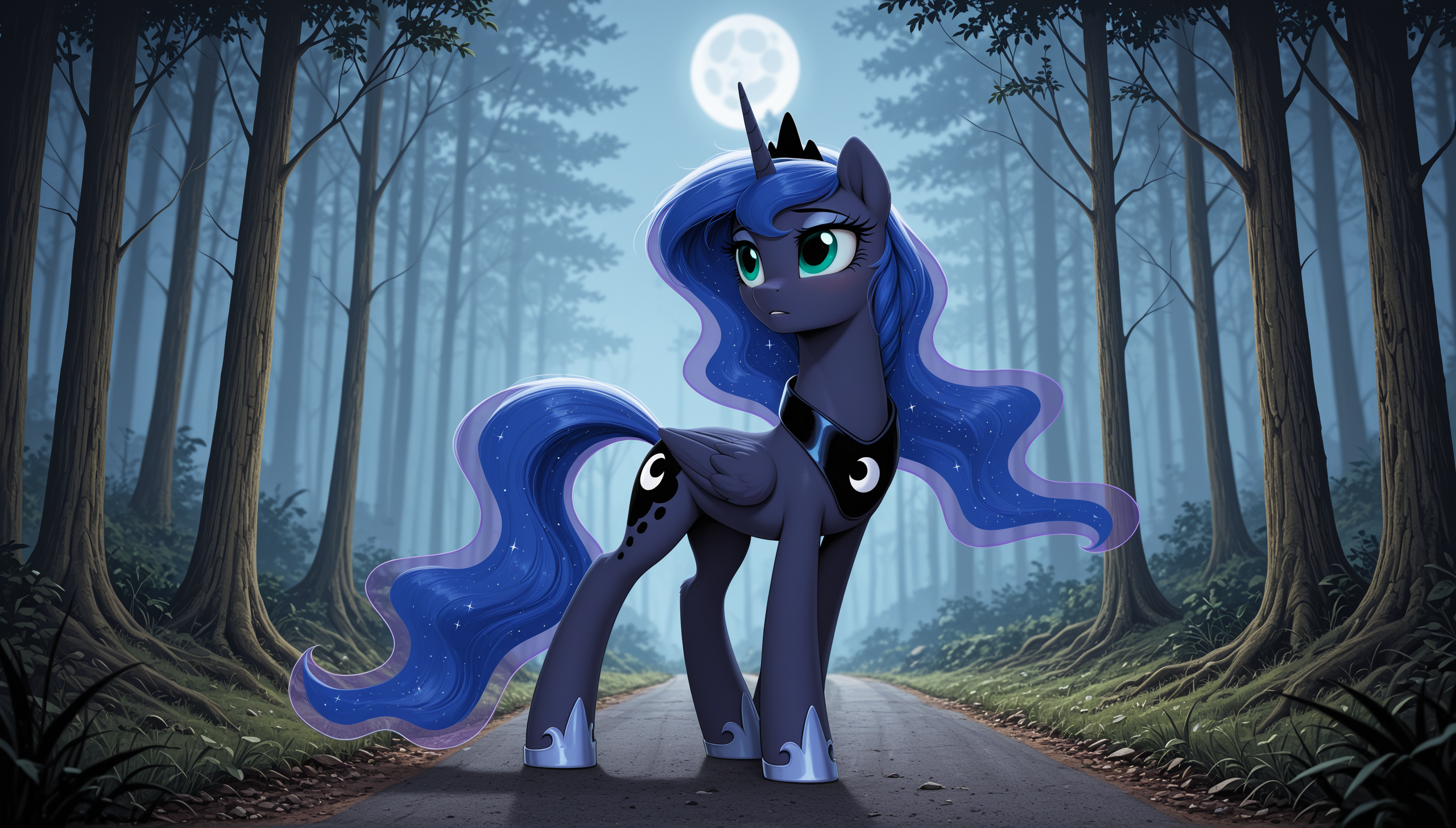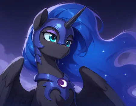 Princess Luna is an alicorn, her body is the dark blue of the night sky, Her mane and tail are long and wavy, Her eyes are green, She wears a crescent-shaped ornament on her neck, and a crown on her head