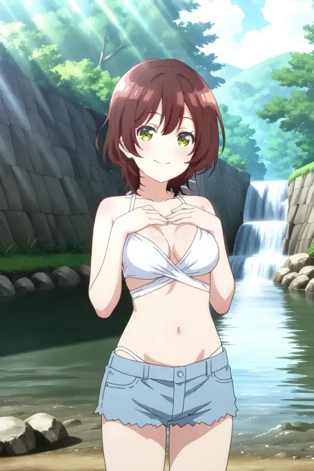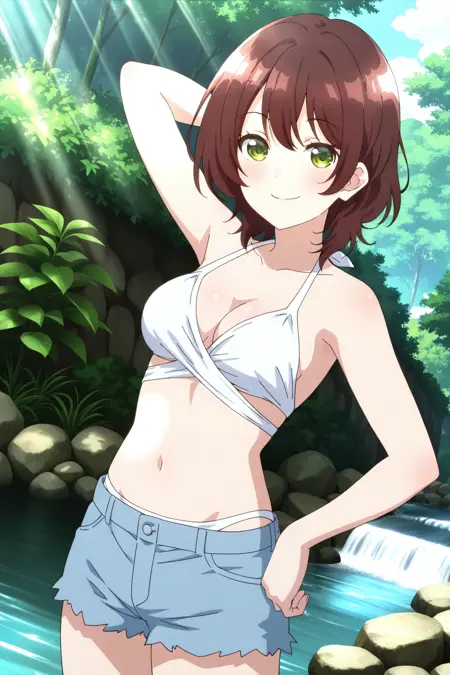 hinami aoi, 1girl, solo, brown hair, short hair, green eyes, medium breasts, white bikini, blue shorts, denim shorts, short shorts, cutoffs