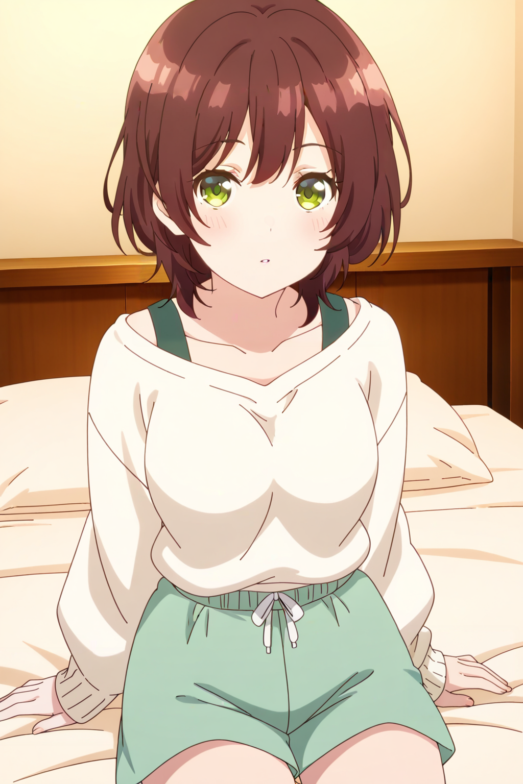 hinami aoi, 1girl, solo, brown hair, short hair, green eyes, medium breasts, white sweater, long sleeves, off shoulder, green shorts