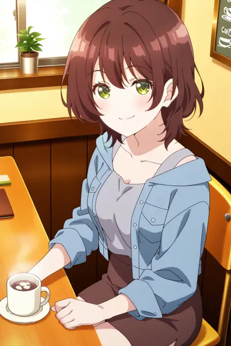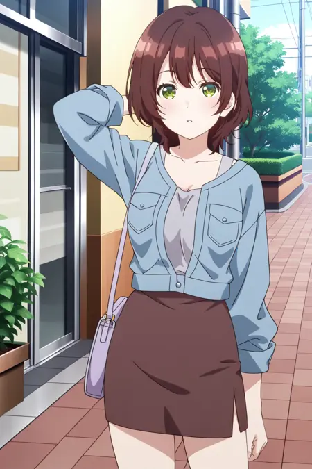 hinami aoi, 1girl, solo, brown hair, short hair, green eyes, medium breasts, blue jacket, denim jacket, long sleeves, grey tank top, brown skirt, pencil skirt