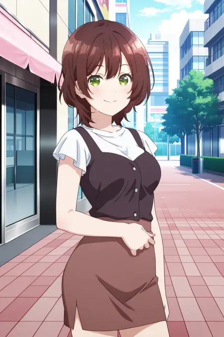 hinami aoi, 1girl, solo, brown hair, short hair, green eyes, medium breasts, black bustier, white shirt, frilled shirt, t-shirt, short sleeves, brown skirt, pencil skirt