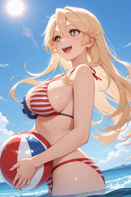 为了她的国旗比基尼,请添加:"smmriw, blonde hair, hair between eyes, long hair, blue eyes, star-shaped pupils, headgear, american flag bikini"