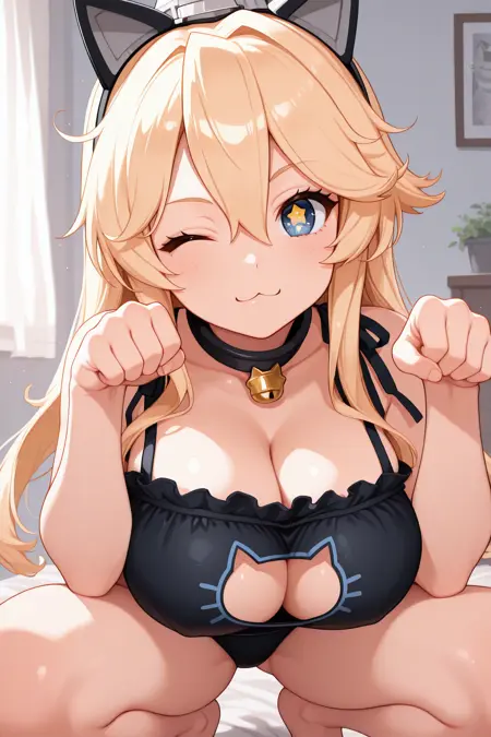 为了她的常规形象,请添加:"defiw, blonde hair, hair between eyes, long hair, blue eyes, star-shaped pupils, headgear, metal collar, black shirt, sleeveless shirt, front-tie top, cleavage, grey leotard, navel, detached sleeves, two-tone gloves, black gloves, wrist cuffs, belt, miniskirt, striped skirt, white skirt, dark blue skirt, garter straps, striped thighhighs, mismatched legwear, white boots"