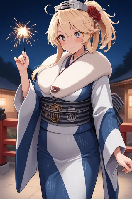为了她的新年装束,请添加:"nyriw, blonde hair, hair between eyes, short ponytail, blue eyes, star-shaped pupils, headgear, hair flower, blue kimono, fur-trimmed kimono, american flag kimono, wide sleeves, black sash, tabi"