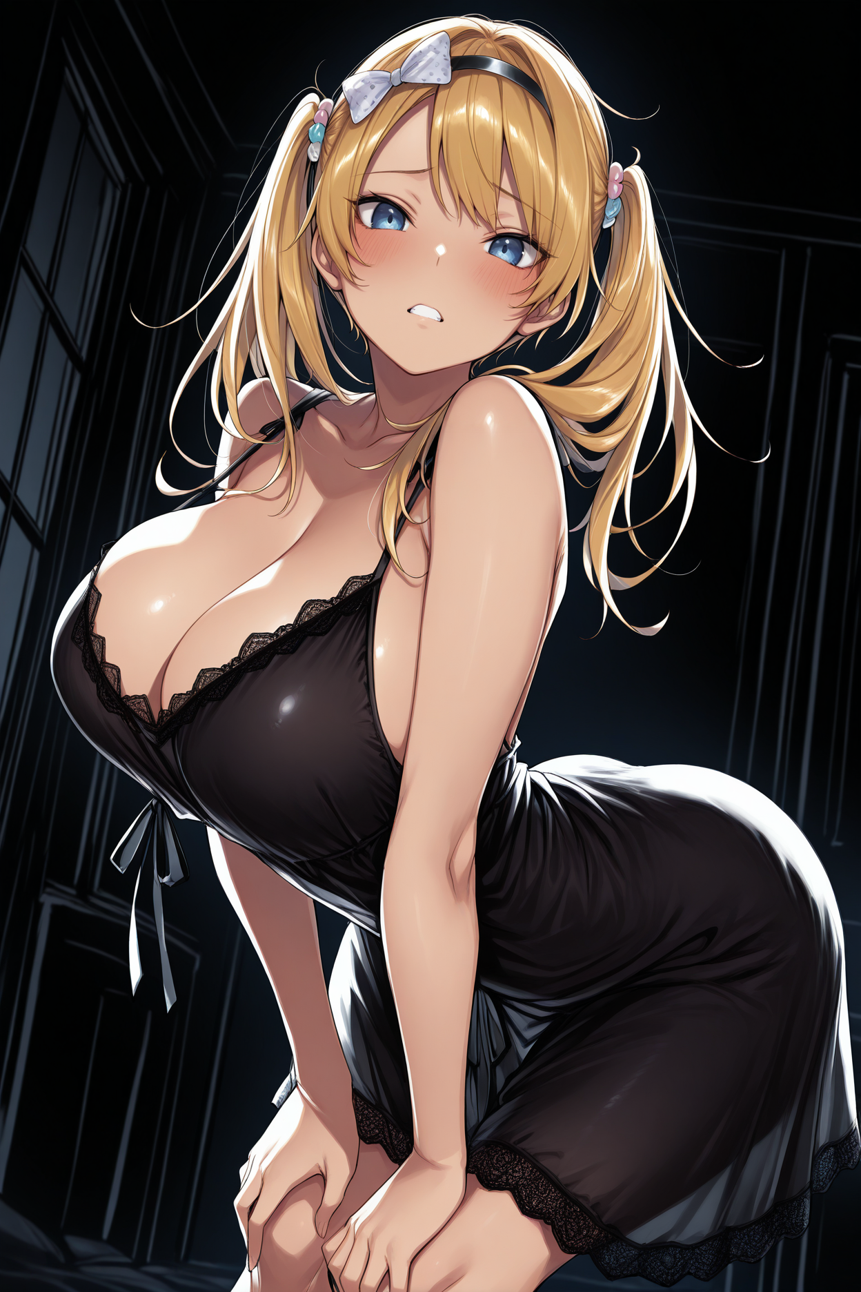 触发词为 "ymybi",且必须包含 "金发、双马尾、长发、蓝眼睛"。