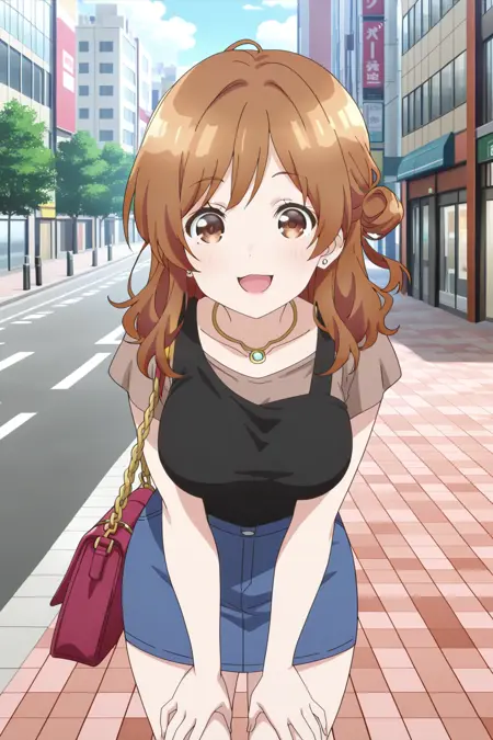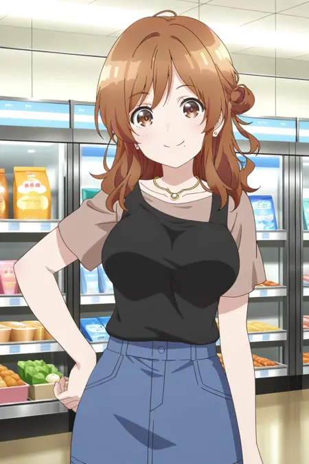 izumi yuzu, 1girl, solo, brown hair, long hair, single side bun, brown eyes, mole under mouth, large breasts, black tank top, brown shirt, t-shirt, short sleeves, blue skirt, denim skirt, pencil skirt, earrings, necklace