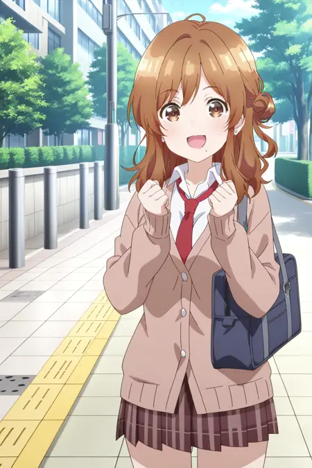 izumi yuzu, 1girl, solo, brown hair, long hair, single side bun, brown eyes, mole under mouth, large breasts, school uniform, brown cardigan, white shirt, collared shirt, long sleeves, red necktie, brown skirt, plaid skirt, pleated skirt, earrings