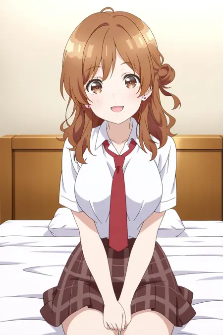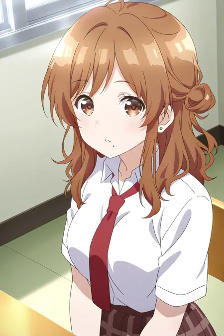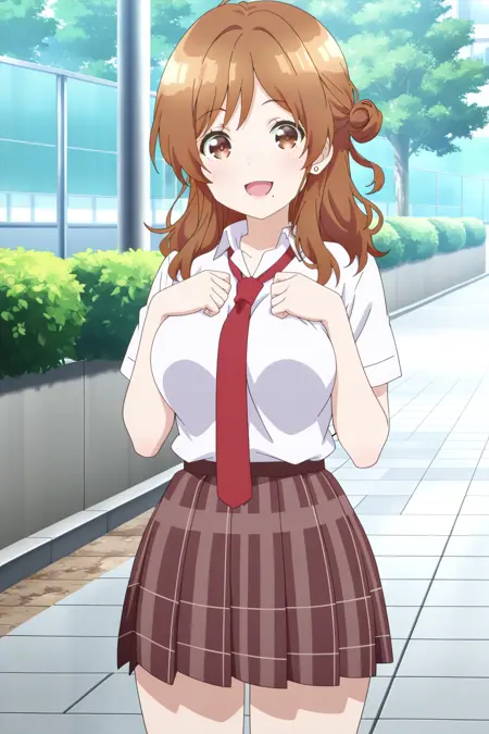 izumi yuzu, 1girl, solo, brown hair, long hair, single side bun, brown eyes, mole under mouth, large breasts, school uniform, white shirt, collared shirt, short sleeves, red necktie, brown skirt, plaid skirt, pleated skirt, earrings