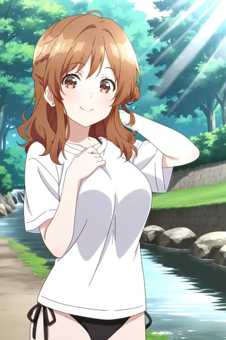izumi yuzu, 1girl, solo, brown hair, long hair, single side bun, brown eyes, mole under mouth, large breasts, white shirt, t-shirt, short sleeves, bikini under clothes, black bikini, side-tie bikini bottom, earrings