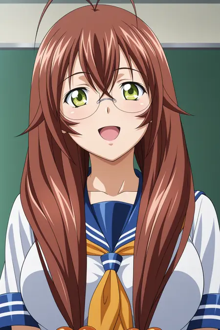 ryuubi gentoku, long hair, brown hair, low twintails, hair bobbles, antenna hair, crossed bangs, green eyes, rimless eyewear, short sleeves, white shirt, blue sailor collar, yellow neckerchief, blue skirt, pleated skirt, white socks, ankle socks, brown footwear, loafers