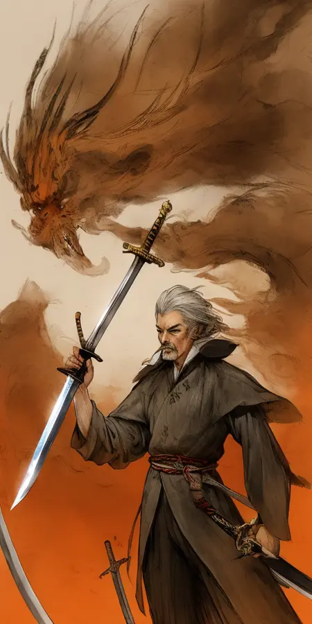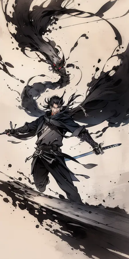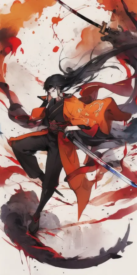 正向提示词: a man wields a sword, ink picture, ink illustration, best quality, masterpiece, ultra high res, 1girl, beautiful_face, detailed skin, gu, dragon, full body, weapon, black hair, holding weapon, blood, arm guards, male focus, looking at viewer, black eyes, tabi, floating hair, full body, orange, hands up,