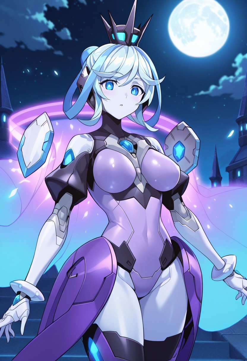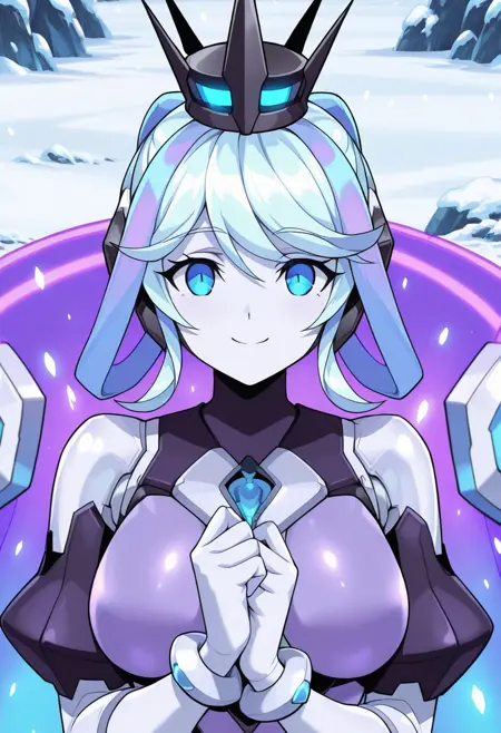 trigger word-hail(ix2), colored skin, blue eyes, short hair, crown, headgear, purple armor, bracelet, detached cape
