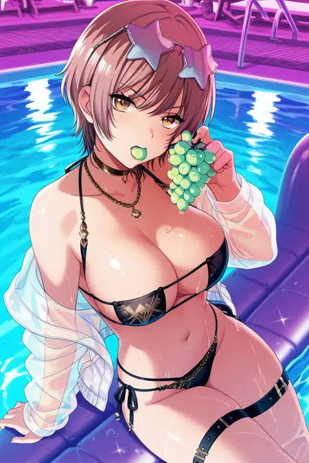 weronika, 1girl, solo, breasts, swimsuit, bikini, short hair, jewelry, eyewear on head, looking at viewer, necklace, sunglasses, choker, navel, cleavage, thigh strap, brown hair, medium breasts, bikinisk