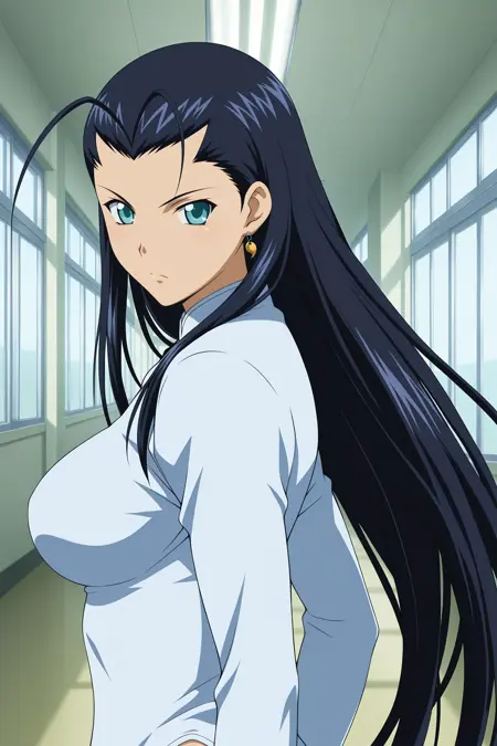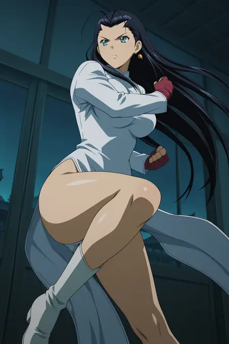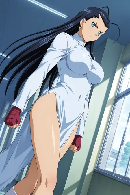 kakouen myousai, long hair, black hair, antenna hair, aqua eyes, magatama earrings, single earring, long sleeves, white dress, red gloves, fingerless gloves, pelvic curtain, white footwear, boots