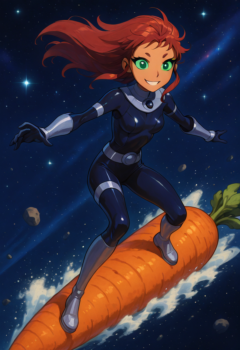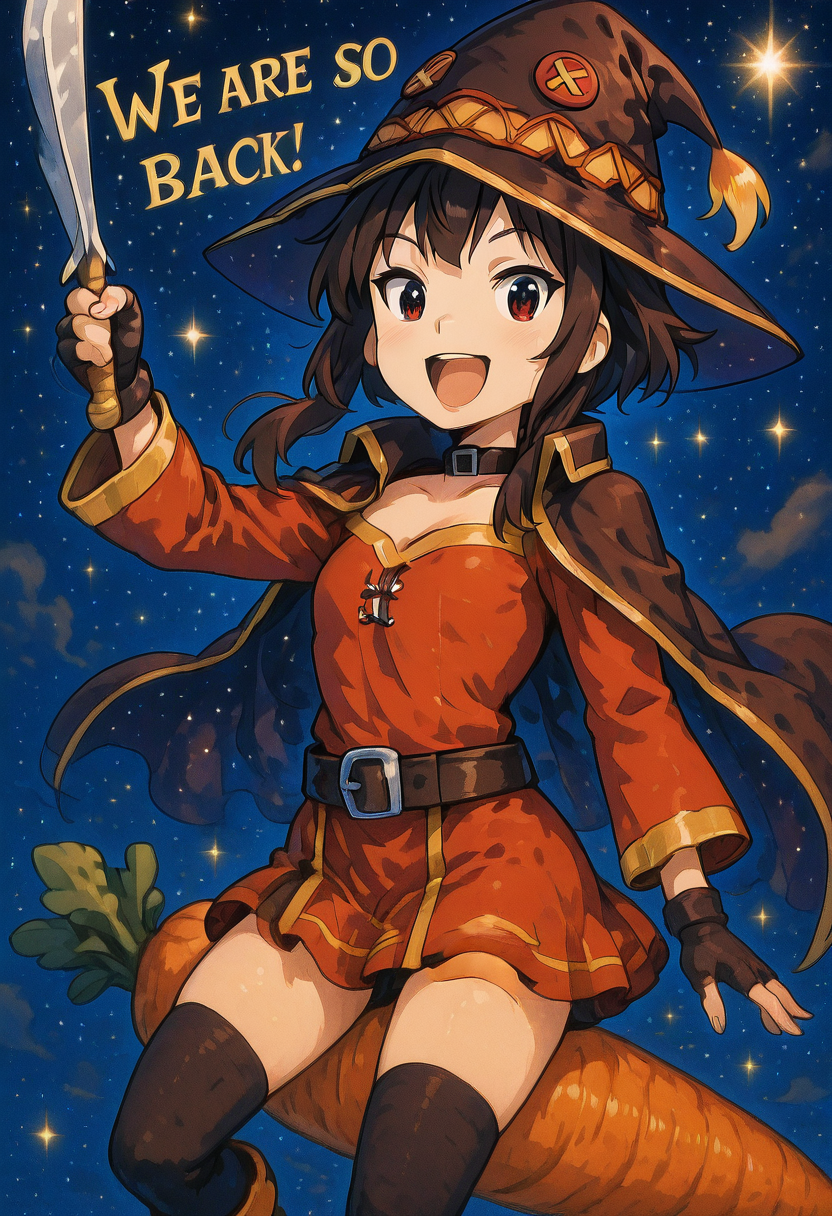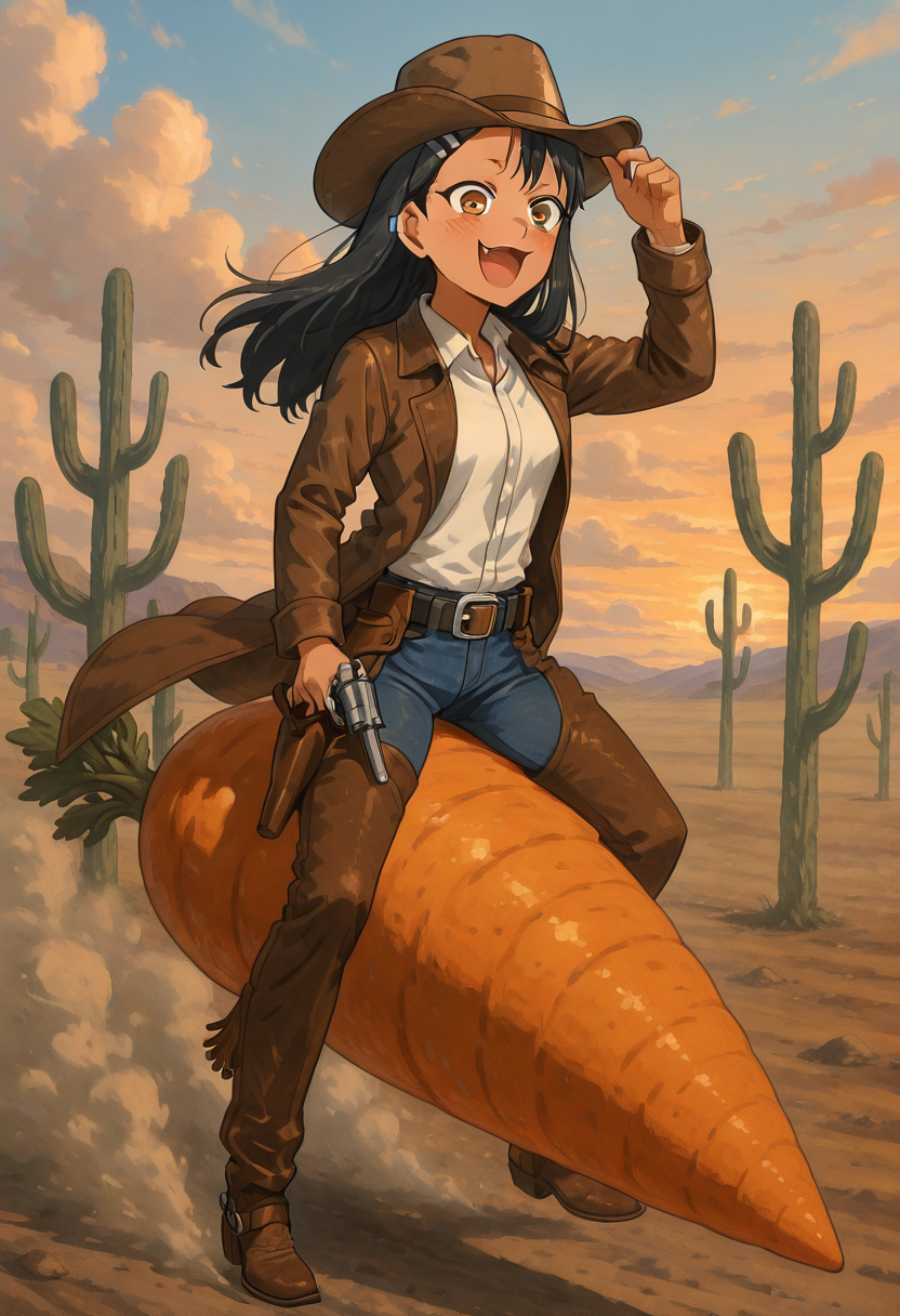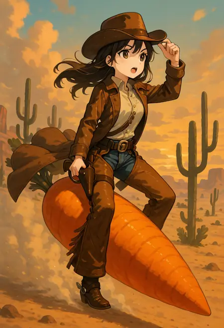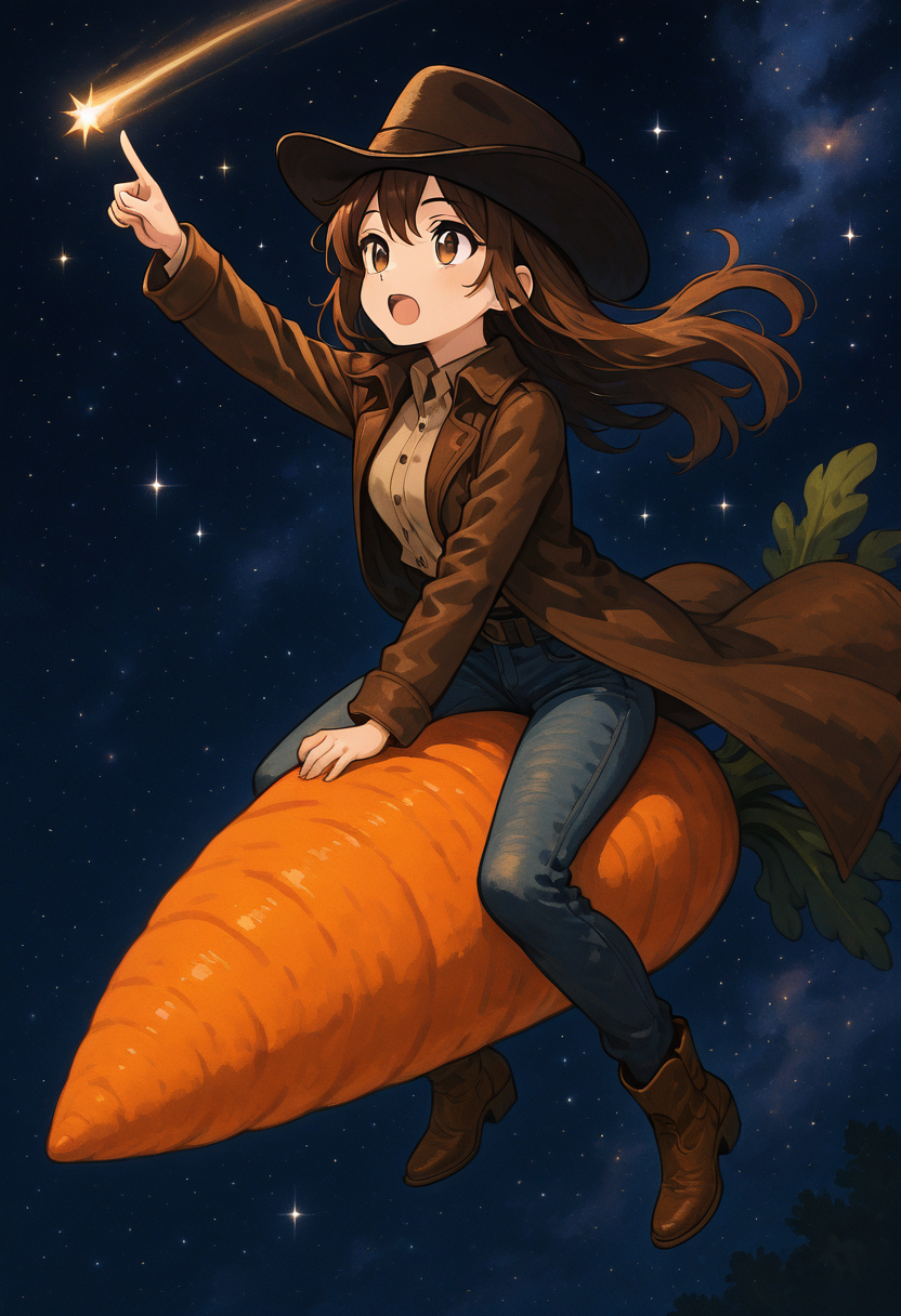 | トレーニングワード | C4rr0tR1d3r, night, feet out of frame, star (sky), night sky, starry sky,コピーしました! C4rr0tR1d3r, open mouth, bangs, shirt, long sleeves, hat, jacket, full body, weapon, boots, outdoors, open clothes, sky, collared shirt, pants, cloud, coat, gun, dress shirt, brown footwear, sunset, open coat, brown headwear, holster, brown coat, cowboy hat, revolver, desert, cowboy western, holstered weapon, dust cloud, cactus, oversized food,コピーしました! |