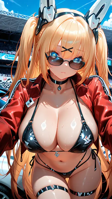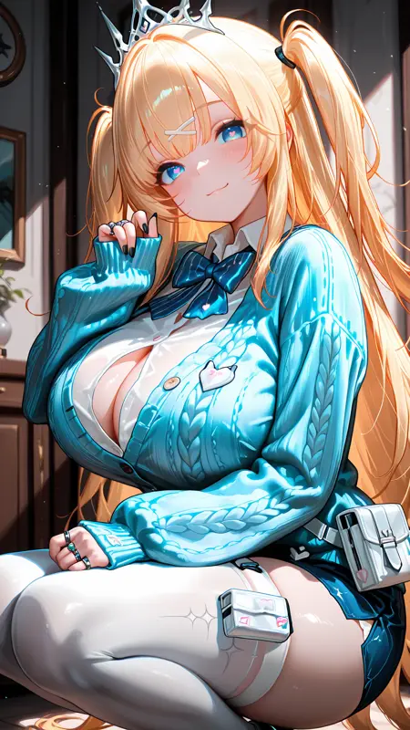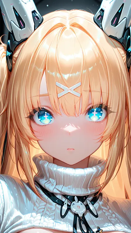 deflps, 십자형 동공, 기계식 귀, 흰색 터틀넥 스웨터, 짧은 상의, 언더부브, 투명한 옷, 투명한 드레스, 투명한 골반 커튼, 팬티스타킹, 허벅지 스트랩, 버클, 흰색 스트랩, 목고리, x 헤어 장식, 허벅지 파우치