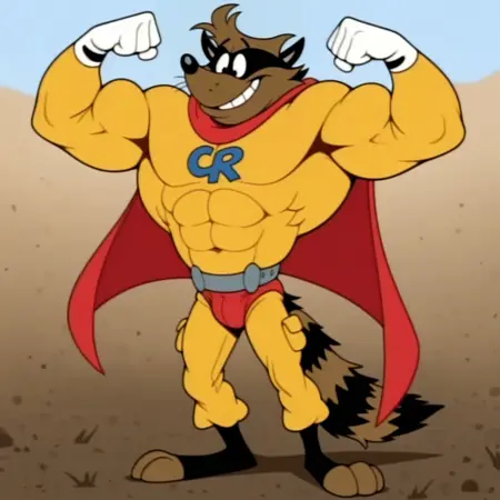| 训练词汇 | male, furry male, solo, raccoon, brown fur, black fur, two-tone fur, short hair, black eyes, black nose, whiskers, bellybutton, 2 toes, striped tail, chubby已复制! yellow jumpsuit, white gloves, patches, grey belt, red underwear, red cape, bandage on face已复制! yellow jumpsuit, white gloves, grey belt, red underwear, red cape已复制! |