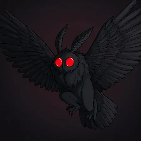 Mothman(character), male, black fur, red sclera, no pupils, moth, wings, feathered wings, no humans,