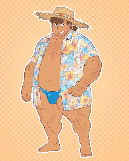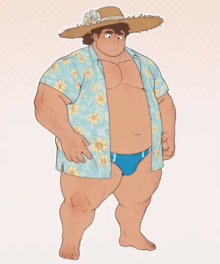비치 복장: 벌거벗음, 파란색 열린 꽃무늬 셔츠, 느릅나무 모자, 파란색 스피도