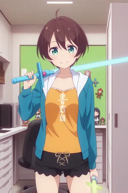aahajime, 녹색 눈, 갈색 머리, ahoge, hajimec3, 노랑 텅탑, 데님 반바지, 짧은 반바지,