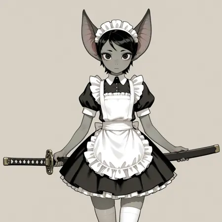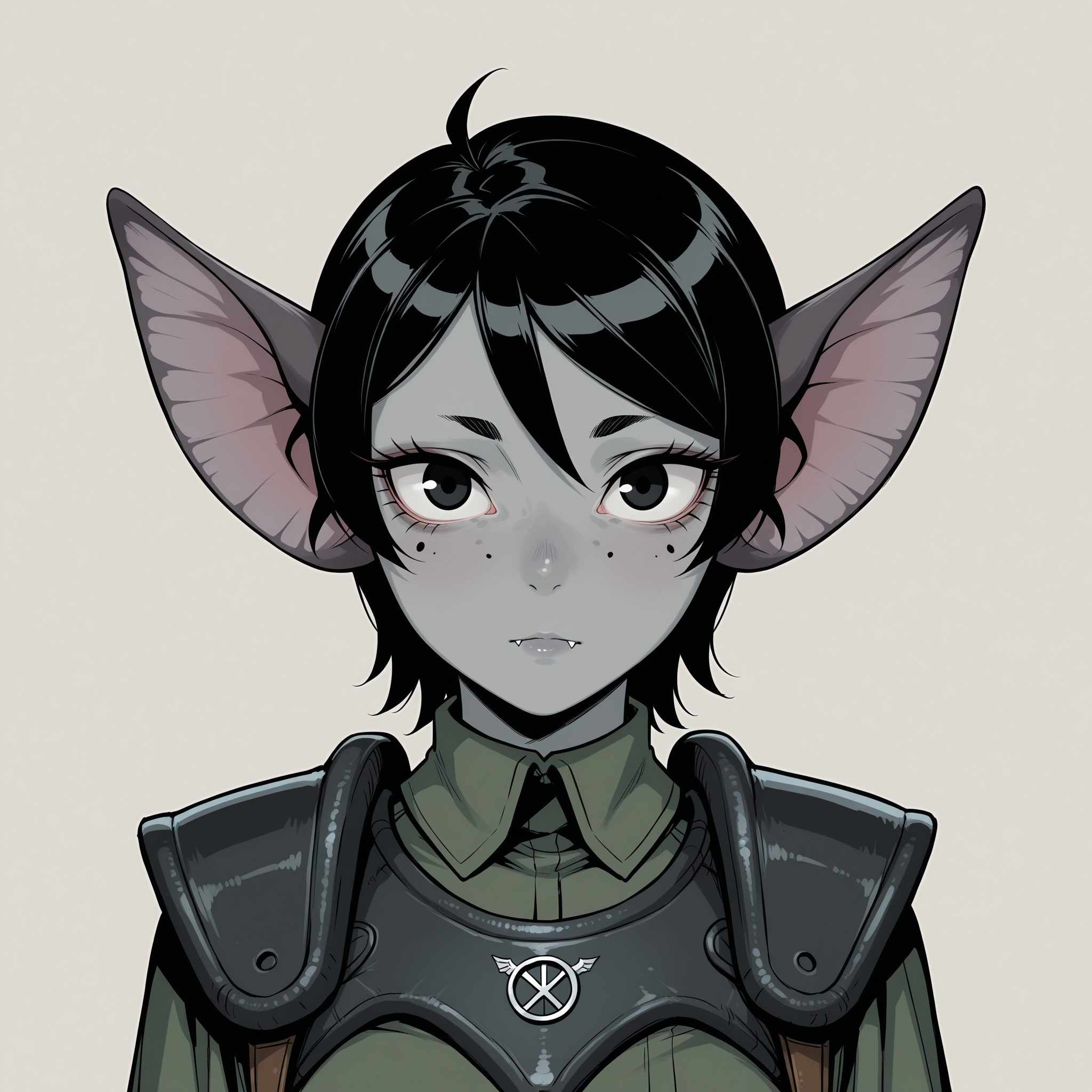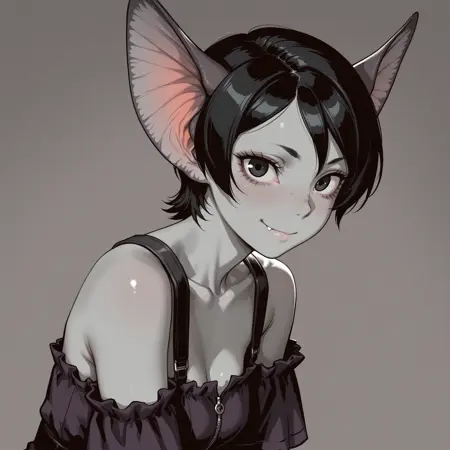 nightsider, grey skin, black eyes, bat ears, short hair, black hair
