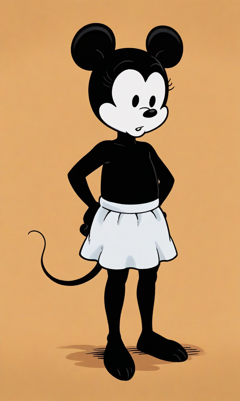 触发词:1girl, minnie1928, dot eyes, black body, white face, round ears, white skirt, mouse tail