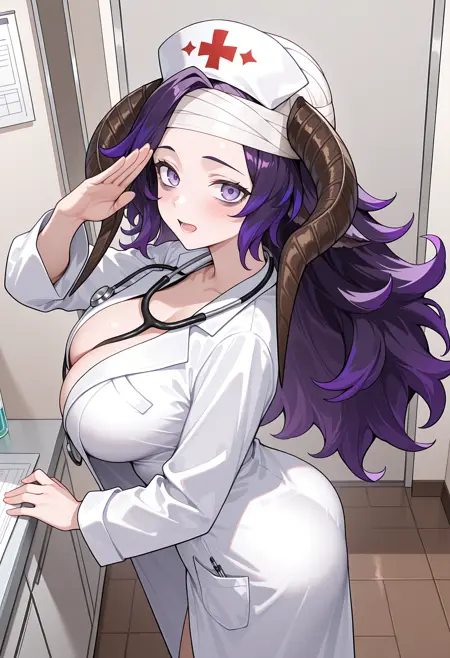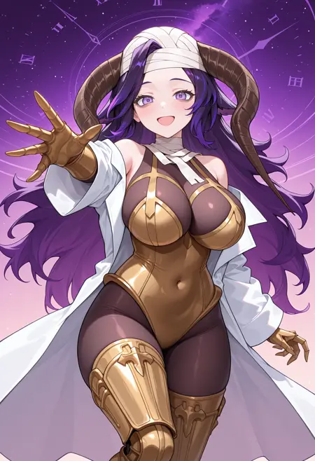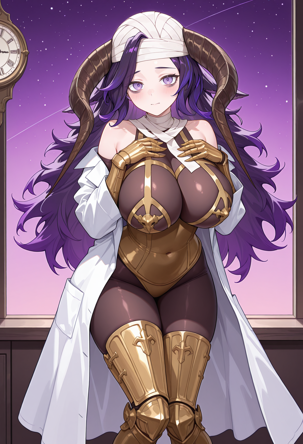 gbfforo, 長い髪, 紫髪, 多色の髪, 紫の目, 角, 大きな胸, 額, 頭に包帯, 目の下のクマ,