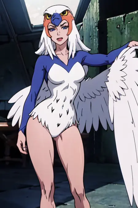 - wings, feathered wings, feathers, white hair, angel wings, white wings, harpy, leotard, winged arms, bird wings, helmet, multiple wings,