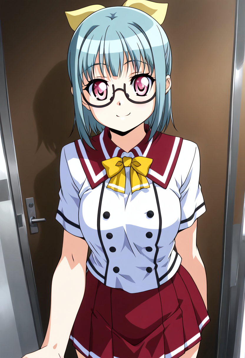 short sleeves, yellow bowtie, school uniform, white shirt, red skirt,