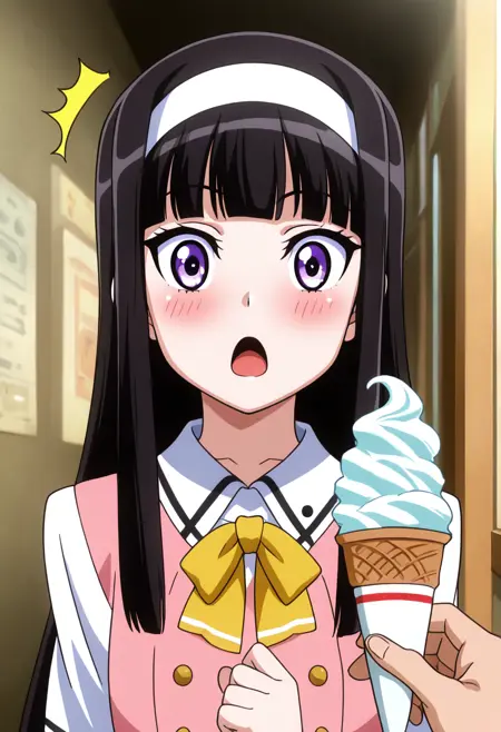 zzMidori, purple eyes, black hair, long hair, white hairband, pink vest, long sleeves,